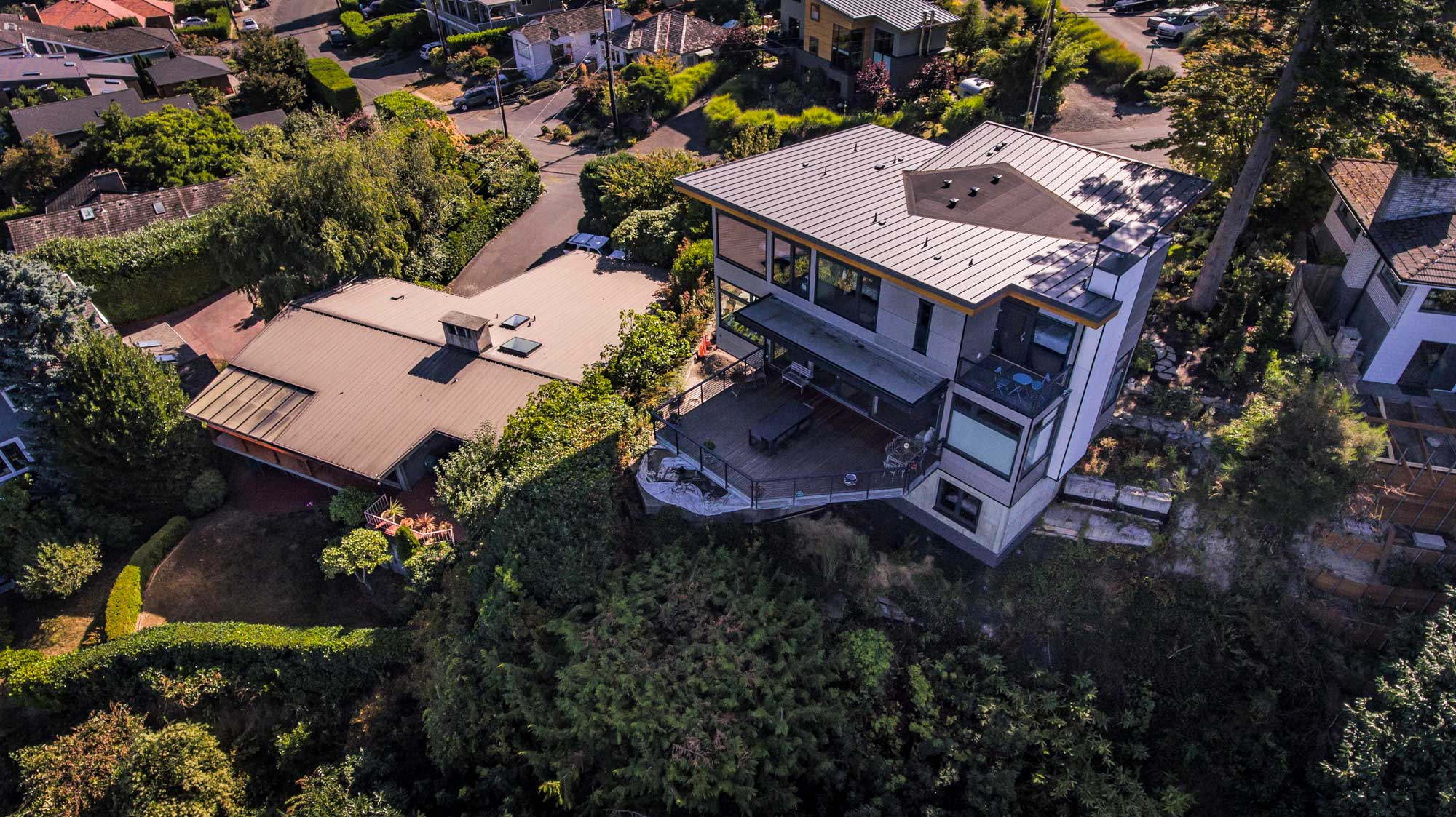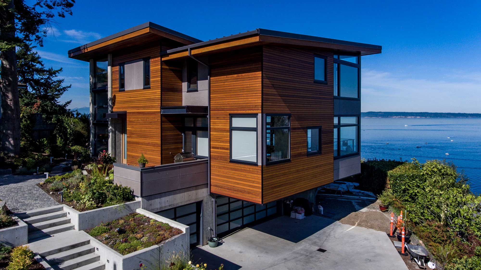 North Beach Seattle home above Golden Gardens featuring custom rainscreen siding with clear cedar planks and fiber cement panels overlooking Puget Sound.